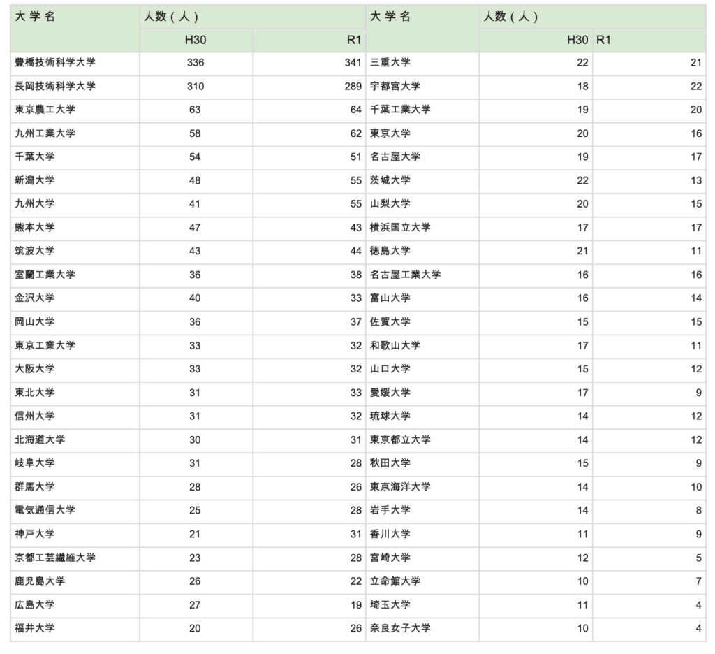 これは皆さんと僕の先輩にあたる、平成30年度と令和元年度の高専卒業生の進学先を示した表です。