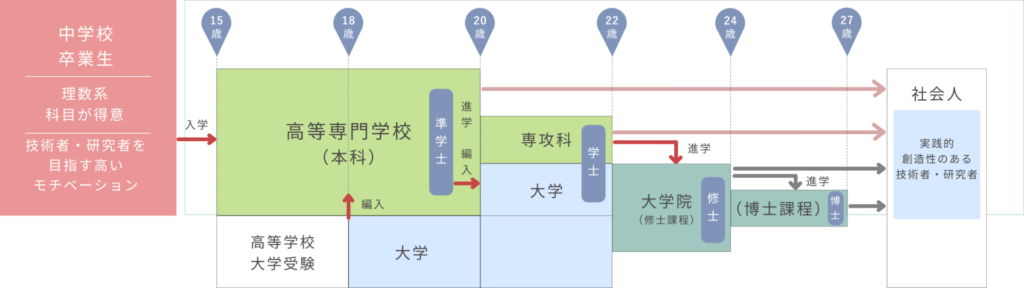 また、高専はそのほとんどが工業高専であるため、進学先は主に工学部になることが多いです