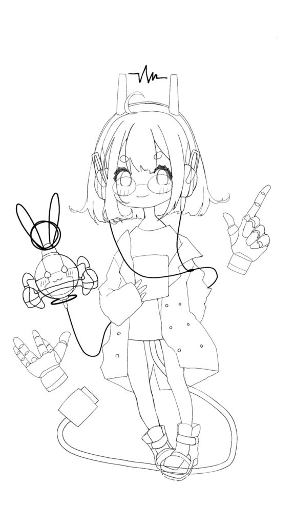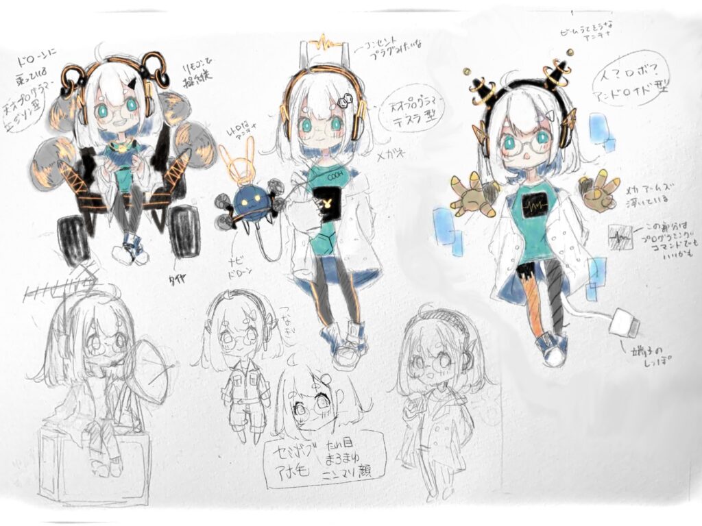 ただ、右側のラフのメカアームや端子のしっぽも良いアイデアだと思ったので、「真ん中のラフにこういったメカ要素を追加してほしいです!」と追加でお願いをしました。
