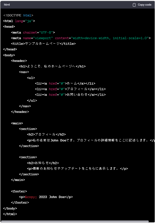 「ホームページを使うのに使えるサンプルhtmlコードを教えて」
