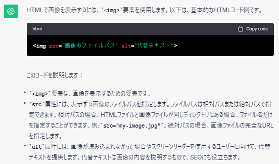 そこで「HTMLで画像の大きさを指定する方法をおしえて」とチャットすると