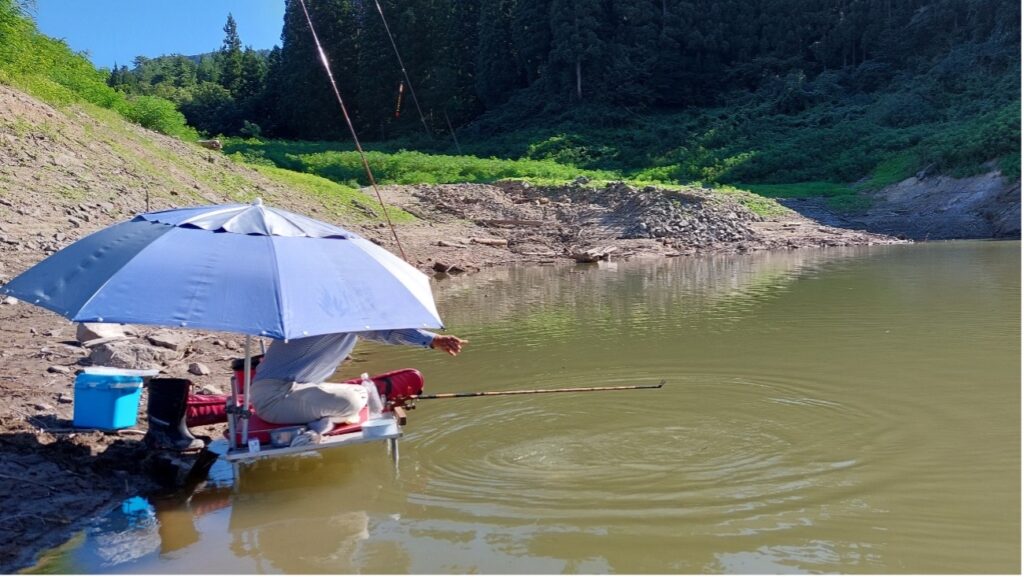 ヘラブナ釣りは普通の釣りとは異なり、水の上に台を設置し、その上に座って釣る形に