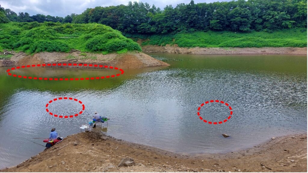 ポイントは〇枠の場所!岸からほど近く台が設置しやすい場所もおすすめです!