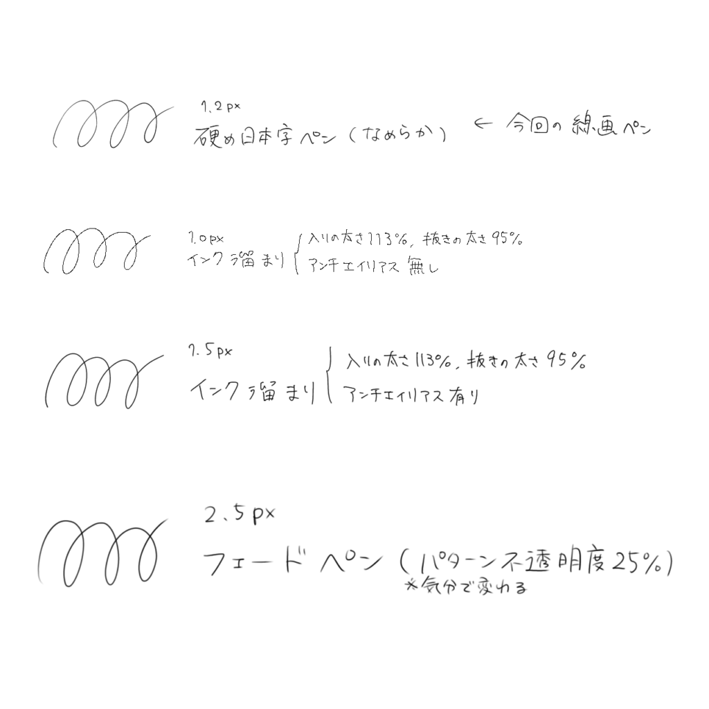 私はフェードペン・インク溜まり(入り抜きの太さを100%にカスタマイズしたもの)・硬め日本字ペン・インク溜まり(上のカスタム+アンチエイリアスを切ったもの)など色々試して今のところ硬め日本字ペンとアンチエイリアスを切ったペンに落ち着いています。