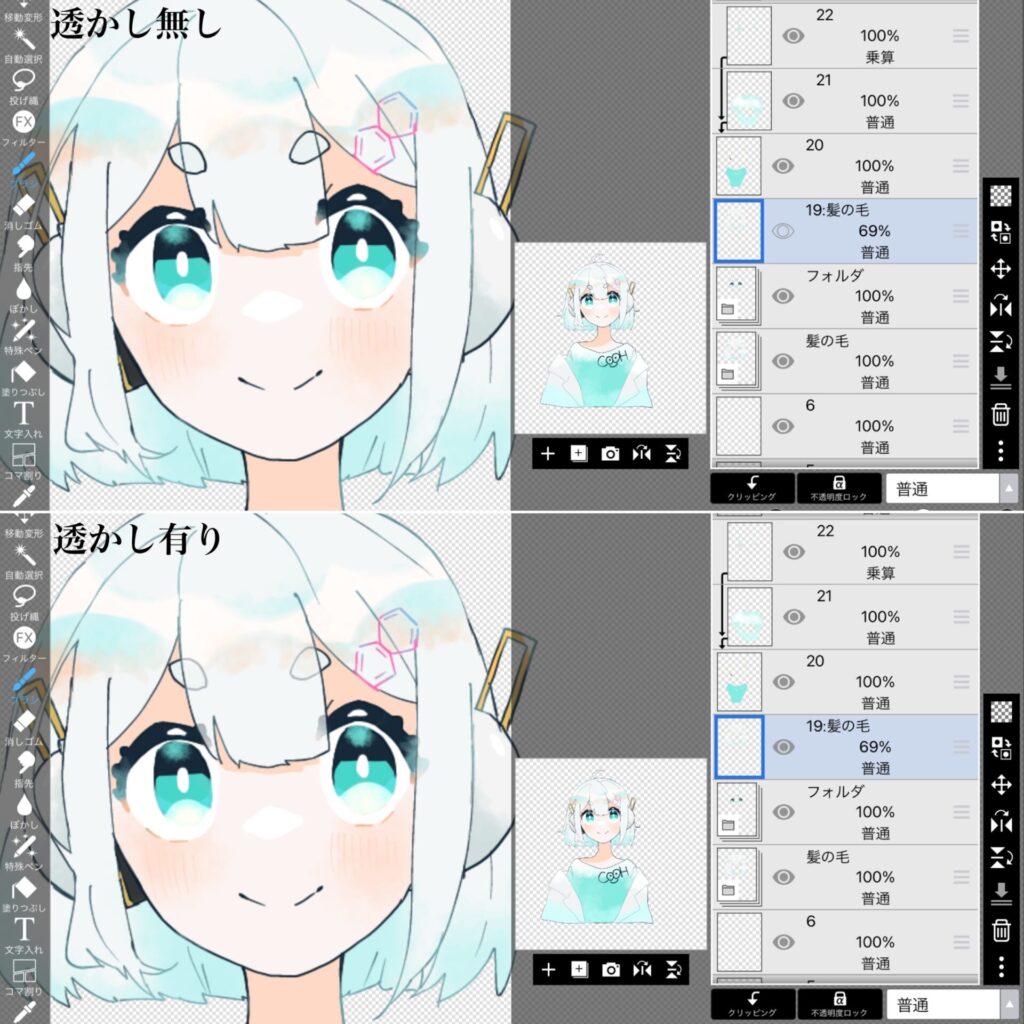 などがあるのですが、一番は「目と髪の毛が被った時に別々で残しておくと透けるようにできる」です。
