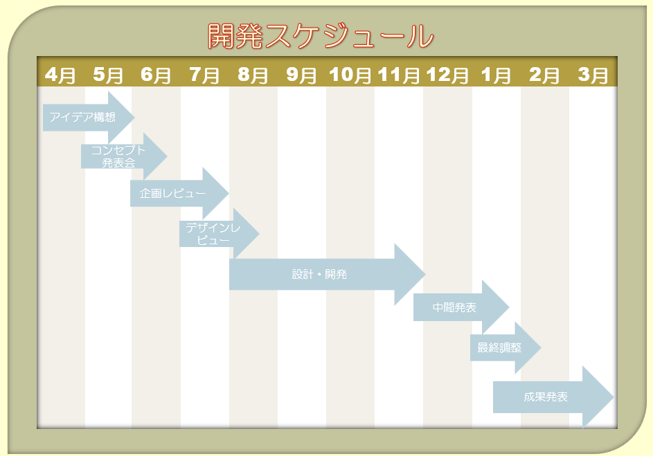 創造設計の授業は、大まかに構想、複数回にわたるアイデアのレビュー、設計、開発、成果発表会の順で行われます。各月ごとの作業内容を以下にまとめます。