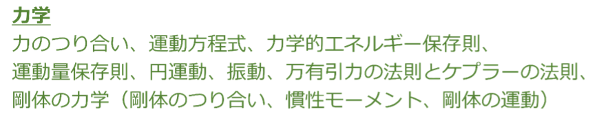 力学は基本的に大学範囲から出題されますが、高校範囲の問題の解法が大学範囲の学習にかなり役立ちます。大学範囲で初めて、ベクトル、内積・外積、微分積分、微分方程式といった数学を用いますが、力を図示し、条件から立式するという力学の本質は同じですから、まずは高校範囲の演習をしましょう。