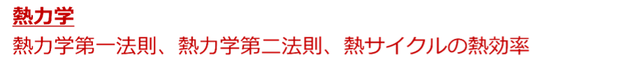 熱力学第一法則と理想気体の状態方程式を組み合わせることで、ほとんどの基本問題を解くことができます。この2つはマイヤーの関係式やポアソンの法則の導出に使われるほか、熱サイクルの熱効率を求める際に必須となります。熱効率の問題は、工学応用上重要であるため、花形の問題と言えます。熱力学第二法則は言葉で表されるため、計算問題に使うことはありませんが、エントロピーの変化は求められるようにしましょう。熱効率の問題と併せて出題されます。